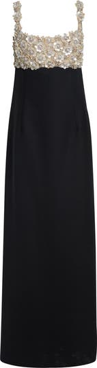 A masterclass in refined opulence, this statuesque column gown is tailored in a virgin-wool blend with a bustier bodice meticulously hand-embellished with intricate blossoms of mother-of-pearl and crystals.