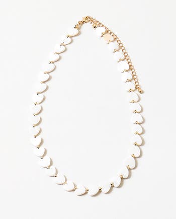 You know how much we love hearts and the creamy iridescent look of mother-of-pearl. We decided to combine both of these loves into the mother of pearl necklace. Hearts surround this piece and are spaced out by gold beads. A beautiful piece that stands on its own or latter with other favorites.