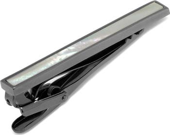 This polished gunmetal tie clip is adorned by a luminous mother-of-pearl inlay for subtly sophisitcated look.