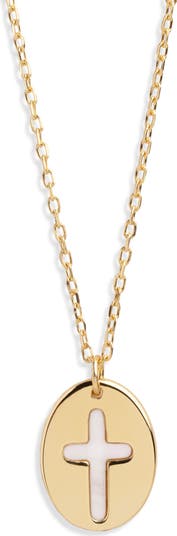 A mother-of-pearl inlay brings a milky glow to the cross pendant of this dainty necklace plated in 18-karat gold.