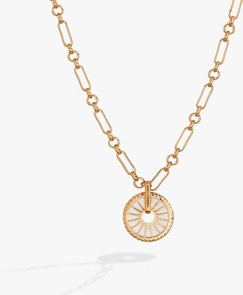 A luminous burst of energy. This open link chain toggle necklace features a mother-of-pearl starburst pendant, detailed with a radiant gold star. The toggle clasp loops through the starburst itself—seamlessly blending form and function in a celestial-inspired statement piece.