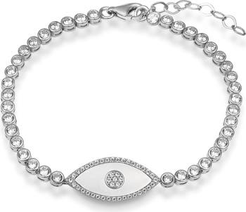 Protective charm meets modern elegance in this Evil Eye Crystal Tennis Bracelet. Designed with a sleek row of bezel-set crystals and a carved mother of pearl center, it features a luminous evil eye centerpiece accented with pavé detailing for extra sparkle. Symbolizing protection and positivity, this bracelet is both meaningful and stylish—perfect for everyday wear or stacking with other favorites