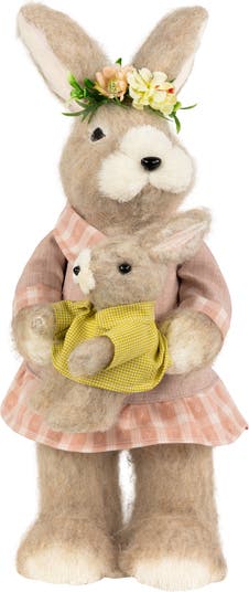 Experience the enchantment of Easter with this delightful mother and baby rabbit Easter figure. This charming piece captures the essence of the season, showcasing a tender moment between a loving mother rabbit and her adorable baby bunny. Whether displayed as a centerpiece or nestled amongst your Easter decorations, this figure radiates a sense of love and new beginnings. Product Features: Decorative Easter rabbits figure Mama rabbit holds her baby bunny Mama i0s dressed in a plaid rose pink and white dress adorned with wooden buttons Baby bunny is dressed in a checkered white and yellow shirt Flowers decorate Mama rabbit's head Recommended for indoor decorative use only Dimensions: 14.5“H X 6"W X 7"D Materials: fabric/faux fur/plastic/foam