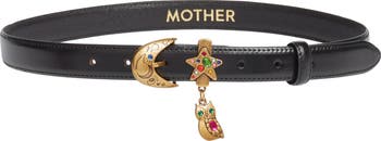 Colorful jewel embellishments highlight the celestial-inspired hardware on a slim belt shaped from rich leather.