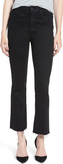 Ragged cutoff hems highlight the trend-right cropped flare silhouette of ultra-dark high-rise jeans that transition seamlessly from day to night.
