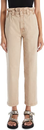 A ruffle detail at the high waist softens the utility-inspired look of straight-leg jeans cut in an ankle-grazing length.