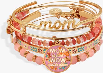 Mom deserves a stack as amazing as she is. This set of five bracelets is a beautiful mix of love and style: a charm bangle that reads “Mom is just wow upside down,” a floral bead and pink rose quartz bracelet for warmth and love, a cuff with a hand-painted floral design, an ombré pink beaded bracelet featuring dyed jade for strength, and a sleek cuff with Mom in elegant script. A heartfelt gift for the woman who does it all.