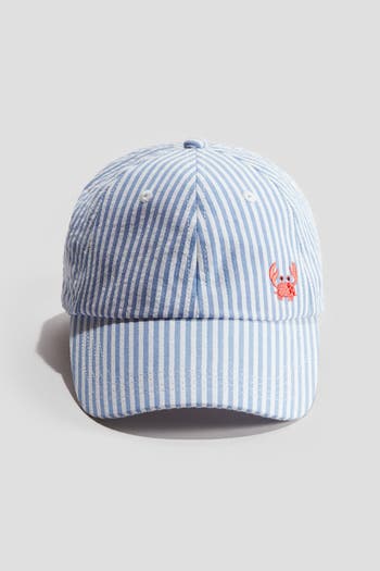 Cap in woven fabric with a motif on the front and a fastener at the back. Cotton sweatband.