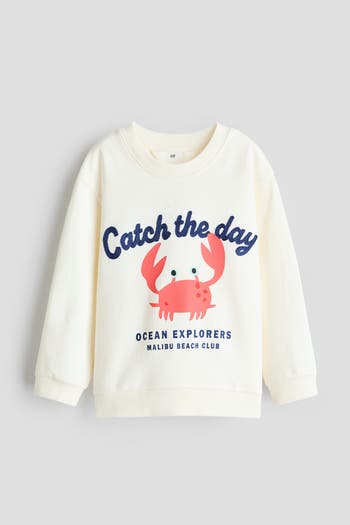 Long-sleeved top in lightweight sweatshirt fabric with print motifs and an embroidered text motif on the front. Dropped shoulders and ribbing around the neckline and at the cuffs and hem.