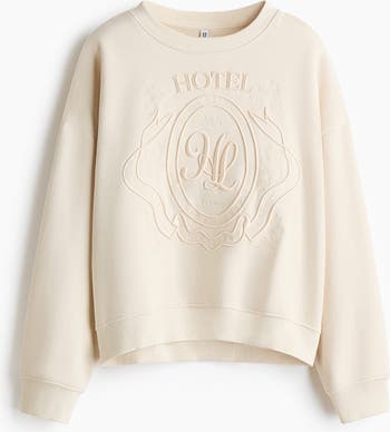 Oversized top in sweatshirt fabric with a soft brushed inside and a motif on the front. Round, rib-trimmed neckline, dropped shoulders and long sleeves. Ribbing at the cuffs and hem.