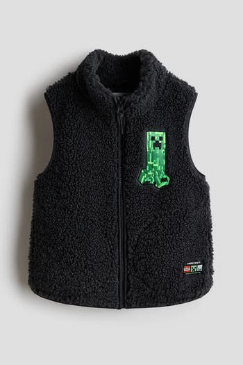 Gilet in soft teddy with a motif on the front. Stand-up collar, a zip down the front and side pockets. Unlined.