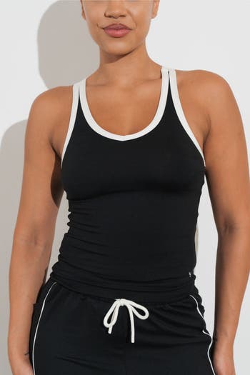 Our updated take on a throwback classic, the Vitality Motive Racer Tank has a flattering fitted silhouette with a V neck and racer back for a long, lean look. Contrast details and our soft, stretchy brushed Motive fabric give this modern women's tank its vintage sporty feel. Made from majority recycled material, Vitality Motive is a brushed, midweight fabric that's ultra-stretchy and made for comfort.