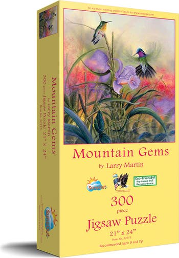 Immerse yourself in the enchanting Mountain Gems 300 piece jigsaw puzzle for adults, featuring the captivating artwork of acclaimed artist Larry Martin. This SunsOut Puzzles product, with a completed size of 21" x 24", brings a vibrant allure of nature into your home, serving as a testament to the marvels of the natural world. The intricately interlocking pieces are crafted from high-quality recycled cardboard, providing both durability and a commitment to sustainability. SunsOut Puzzles uses eco-friendly soy-based inks to ensure each piece is visually vibrant and environmentally responsible, making it an exceptional choice for conscientious consumers. Each puzzle is backed by a worry-free guarantee, adhering to the highest manufacturing standards in the USA, assuring quick resolution to any issues. Renowned for featuring licensed artwork from top artists, SunsOut offers puzzles that are not just engaging but also elevate the fine art of jigsaw puzzles. As a proud woman-owned small business crafting each puzzle in the USA, SunsOut Puzzles represent a fusion of creativity, quality, and community, resonating with puzzle enthusiasts worldwide.