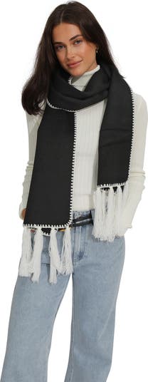A minimalist yet striking accessory designed for both warmth and style. This plain-colored scarf features a subtle contrast stitching around the edges, adding a modern touch to its simple elegance. Finished with delicate fringe for added texture, it’s the perfect balance of understated sophistication and bold detail.