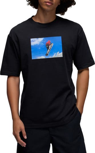 A skybound snowboarder channels the soaring Jumpan logo on a T-shirt made of breathable cotton and marked with artwork incorporating the iconic Jordan 'Wings' image. Wear it when you're heading to the court, climbing the slopes or just enjoying the glow of AJ's winning energy.