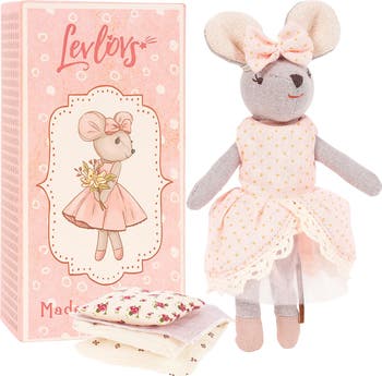 An adorable linen mouse stuffed animal—wearing a sweet little dress and matching bow—is ready for fun from playtime to sleepy time with a matchbox bed that's part of the storytelling experience. It's thoughtfully designed with carefully stitched hand-finished seams, giving it a soft, vintage-modern look and a durable feel.