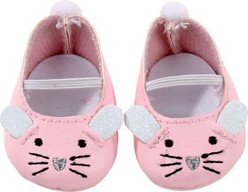 - These shoes are pale pink with cute mouse markings such as a face on the top with white glittery ears, and a white pom pom tail at the back. They also have elastic to keep them on tight.