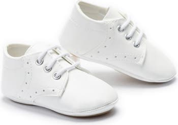 These classic lace-up shoes feature smooth panels with decorative perforations and three eyelets for a timeless look. With soft soles, they are designed for infants, offering both comfort and elegance for special occasions.