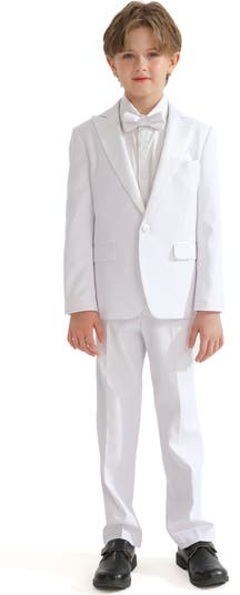 The Peak Lapel Wool Suit, a perfect blend of timeless elegance and modern style. This ensemble includes a premium wool blend blazer, crisp dress shirt, matching pants, and a bow tie. A clean, slim fit suit, impeccably crafted for any special occasion. he