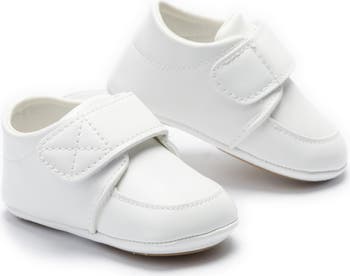 These infant shoes feature a smooth finish, soft soles, and a secure Velcro strap with decorative stitching. Designed for comfort and ease, they add a polished touch to little outfits.