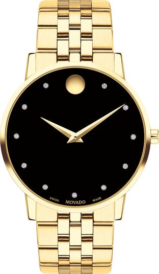 Time doesn't stand still, but it surely stands out on a bracelet watch marked with Movado's classic Museum dot featuring eleven diamonds at the dial markers.
