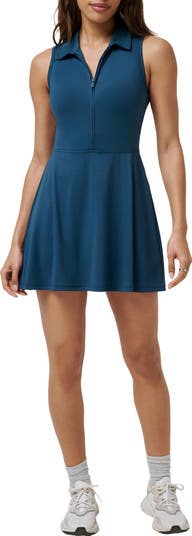 Move from court to street in this sporty sleeveless dress fronted by an easy front zip.