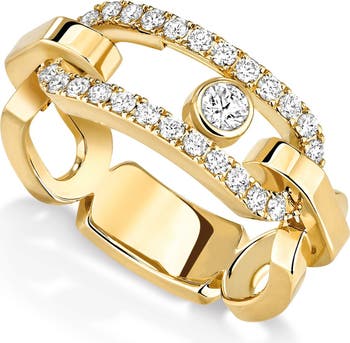 A bezel-set diamond seem to float between the bands of this pavé-detailed ring made of 18-karat gold.