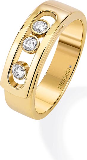 This elegant band compresses three sparkling, rolling diamonds within its openwork silhouette crafted from 18-karat gold.