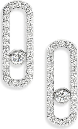 Pared-back graphic lines bring modern elegance to 18-karat-gold earrings sparked with pavé diamonds—plus one that moves within the geometric border.