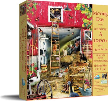 Experience the joy of moving day with SunsOut Puzzles' 1000 piece jigsaw puzzle for adults. Showcasing a vibrant, whimsical artwork by Lori Schory, the rustic barnyard scene comes to life as each piece connects, offering relaxation and mental engagement. Made in the USA, our puzzles guarantee superior quality and craftsmanship thanks to expertly die-cut pieces made from durable, recycled cardboard and printed with eco-friendly soy-based inks - an ideal activity for anyone seeking quality time spent with art and sustainability. We value our planet; thus, all SunsOut Puzzles are created sustainably using top-quality recycled board materials. This puzzle, featuring licensed artwork from top artists, supports a woman-owned small business and lets you contribute towards a sustainable future. We prioritize your enjoyment and satisfaction, offering a worry-free guarantee to resolve any issue you may encounter promptly. Uncover the charm of rural life while letting the engaging Moving Day scene brighten your day, knowing that each precisely interlocked piece represents commitment to creativity, tranquility, and a sustainable world. Perfect for puzzlers of all skill levels, this product serves as a rewarding personal pastime and a cherished gift. Dive in and let SunsOut Puzzles transport you one connection at a time.