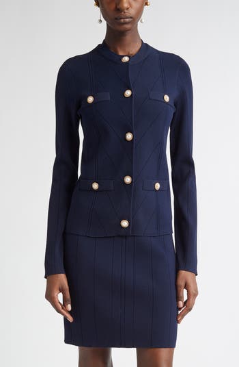 Multidirectional rib panels linked with airy pointelle stitching lend a structured look to this knit jacket polished with eye-catching buttons with pearly centers.