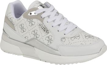 A repeating pattern of interlocked monograms creates a quilted effect across this mixed-media sneaker made in a silhouette inspired by vintage runners. High-polish plate hardware at the heel and metallic logo lettering along the sidewall put a brand signature on the look.