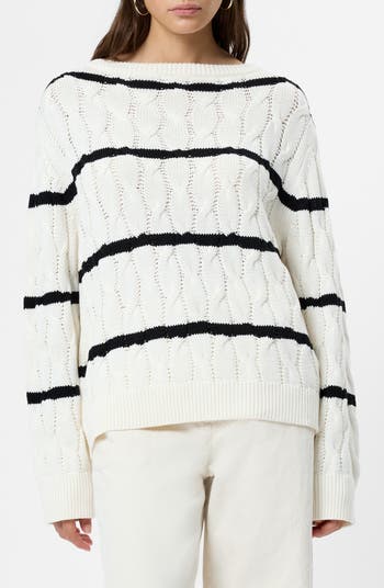 Mozart Stripe Cable Stitch Cotton Boat Neck Sweater