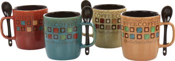 Complete your coffee cup collection with this 8 piece Cafe Americano mug set by Mr. Coffee. These mugs come in assorted colors, each with a graphic COFFEE text design on upper half. Featuring handles that have built in spoon storage for the mini spoons that come in this set. Made of durable and microwave and dishwasher safe ceramic for long lasting use. Convenient mini spoon storage lets you stir without dirtying your dinner spoons, and store mugs and spoons together without worrying about losing any pieces!