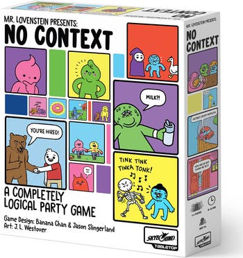 MR. LOVENSTEIN PRESENTS: NO CONTEXT - Skybound Tabletop - In No Context, you'll be making connections using random art from the fabulous Mr. Lovenstein. Lead your opponents to guess your card while deducing your opponent's cards before your rivals. Take Risks and score big or play it safe and bide your time! Game Design: Banana Chan & Jason Slingerland. Art: J.L. Westover. Party Game for 2-6 Players. 20-30 Minute Playing Time. Suitable for ages 13 and up.