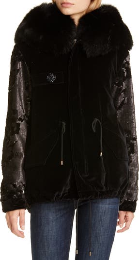 Sequin Embellished Velvet Coat with Removable Genuine Fox Fur Trim