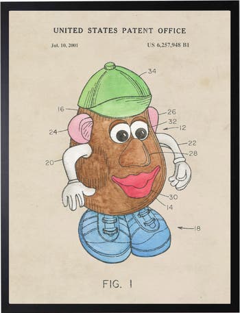 This vintage-inspired print, framed in a black wooden frame, features a Mr. Potato Head patent. Sized at 16 inches by 20 inches, this made in the USA frame makes for a beautiful addition to any wall.