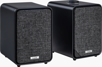 - Rich walnut veneer or charcoal lacquer finish with dark slate woven fabric grille