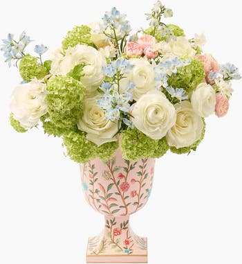 Bring a playful edge to your outdoor dining experiences with our Small Pink Chinoiserie Tole Urn Vase. This pink, iron vase is designed in a tole finish and features intricate chinoiserie-inspired details. Style yours with fresh flowers this season or leave it as a stand-alone accent.