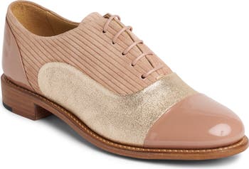 Soft suede and a glittering metallic panel add character to this elegant oxford grounded by a Goodyear welt and stacked heel.