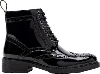 Elevate your style with Ms. Belmont Wingtip Combat Boots. The classic wingtip design and brogue detailing add a touch of sophistication to the black patent exterior. Perfect for any occasion, these boots are a must-have for those looking for timeless elegance.