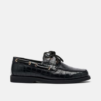 These croc-embossed boat shoes bring a sharp, luxurious edge to a nautical icon, commanding attention with sleek confidence. With their classic moc-toe shape and croc texture, they swap casual leisure for a look of pure, sophisticated power. Croc-Embossed Calfskin Upper Full Calf Leather Lining Padded Insole Rubber Sole Standard B Width