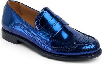 Wingtip styling and brogue perforations add rich dimension to a classic penny loafer featuring a lustrous metallic upper. A contoured cork footbed and Goodyear welt add comfort and stability.