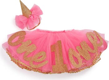 A whole year gone by! She'll pirouette through the party in this festive, flouncy tulle tutu trimmed with glittery golden "One" decorations. An adorable matching headband makes her special day even more delightful.