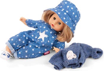 MUFFIN: 13" SOFT DOLL - MY STAR - Gotz Muffin ‘My Star’ is a cuddly 13" soft body doll designed for endless hugs and heartwarming moments. With her sweet sleepy eyes and soft, lightweight body, Muffin is the perfect first doll for toddlers and young children. Her ‘My Star’ outfit adds a touch of sparkle, featuring matching accessories that make her irresistibly adorable. Chic in blue with star pattern, this blonde Muffin is waiting to go outside. Doesn't she look great with her nice hat and fabric sneakers which are matching in blue denim?! If she gets tired she just closes her beautiful blue sleeping eyes and falls asleep with the pacifier in her mouth. Sweet dreams! Muffin’s vinyl arms and legs make her easy to dress, while her plush torso invites snuggles day or night. ENCOURAGING IMAGINATION & PLAYFUL LEARNING: As a Gotz classic, she promotes nurturing play, emotional development, and creative storytelling. Every detail is crafted with care—from her cozy hat to her tiny pacifier—ensuring she stays a beloved companion through every stage of play. Whether for bedtime cuddles or travel adventures, Muffin is ready to make every moment magical. QUALITY MATERIALS & THOUGHTFUL DETAILS: Our 13'' tall Muffins are filled with fluffy cotton wool and granules, making them really cuddly. Children can easily undress them or put their clothes back on. SET INCLUDES: Muffin doll, suit, hat, knitted jacket, shoes, pacifier. SPECIAL FEATURES: Machine washable and suitable for tumble drying. Soft body with vinyl arms and legs. This Muffin has blue sleeping eyes.