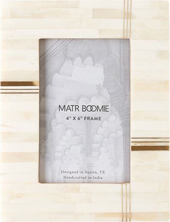 Our Mukhendu Collection incorporates traditional Indian art forms of Old Delhi in modern, grounding designs featuring ethically sourced bone tile and brass accents. This handcrafted photo frame is thoughtfully designed for stylish display with inlaid bone tile accented by slim, gold finish brass bars at top and bottom. For convenient display this picture frame features a two-way table top easel and d-ring for hanging. Frame is easily accessed with metal swivel tabs and access removable back. Sizes include: 4x6, 5x7