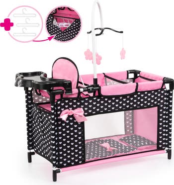 BAYER DESIGN DOLLS: MULTI-BED - BLACK, PINK, HEARTS - Introducing the versatile multi-bed, a must-have accessory for endless playtime adventures with your child's dolls. This lovely black with pink hearts bed offers a multitude of play possibilities, ensuring hours of imaginative fun. Equipped with an integrated highchair, dolls can be comfortably fed thanks to the convenient dining tray. Plus, a compartment with a Velcro fastener provides ample storage space for all the doll's accessories, keeping them neatly organized and easily accessible. With three included hangers, dolls' clothes can be hung up for added realism and organization. Additionally, a changing area behind the seat allows for easy doll changes, while the mobile keeps the doll entertained during the process. But that's not all – the supplied blanket and pillow ensure a cozy and cuddly sleep for the doll, adding an extra touch of comfort and realism to playtime routines. With the multi-bed, the possibilities for imaginative play are endless. Whether feeding, changing, or putting the doll down for a nap, this versatile accessory provides everything needed for realistic and engaging play. Watch as your child's creativity flourishes as they immerse themselves in a world of nurturing and care with their beloved dolls.