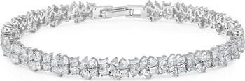 An assortment of hand-set cubic zirconia bring scintillating sparkle to a glamorous bracelet plated in high-shine platinum or 18-karat yellow gold.
