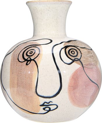 This unique vase is the perfect addition to any boho home. This beautiful hand painted stoneware vase has a round shape, and a unique face on it. This vase looks great with either real or faux florals, and adds a pop of style to any type of neutral room.