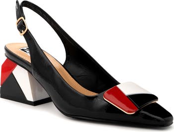 These stylish slingback pumps feature a unique geometric heel design and a colorful accent on the toe